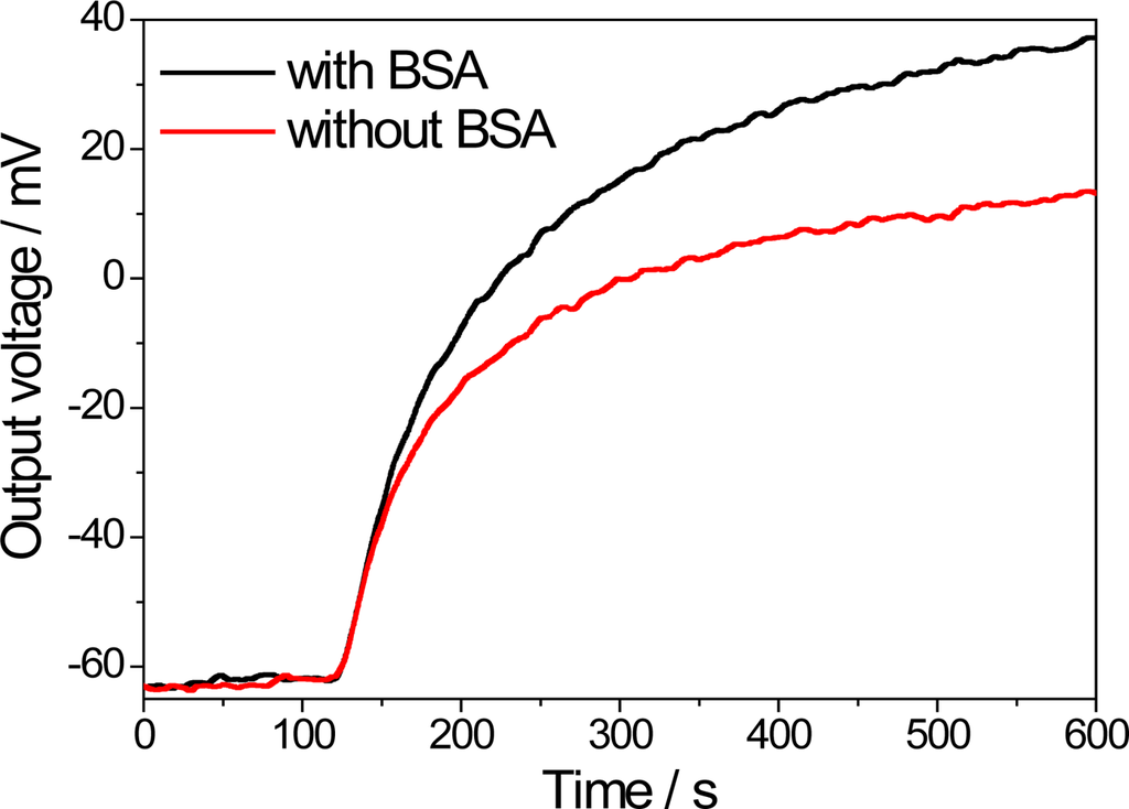 The enzyme immobilization process is an important step in biosensor fabrication since the enzyme cannot be lixiviate from the support. GA is an extensively used cross-linking agent in enzyme immobilization processes in combination with BSA. Figure 2 displays the typical response of the PPI/NiTsPc-GOx FET-based biosensor and the influence of the BSA on the output signal. A response time—defined as the time necessary to reach 90% of the steady-state response [12]—of about 7 min can be estimated. This time appears to be slightly lower for the biosensor without BSA due to the faster ionic diffusion, as the presence of BSA may make the H+ diffusion difficult. On the other hand, the presence of BSA allows greater exposure of the enzyme active sites, since they are not used in the cross-linking process, enhancing the enzyme activity and thus improving the biosensor signal.