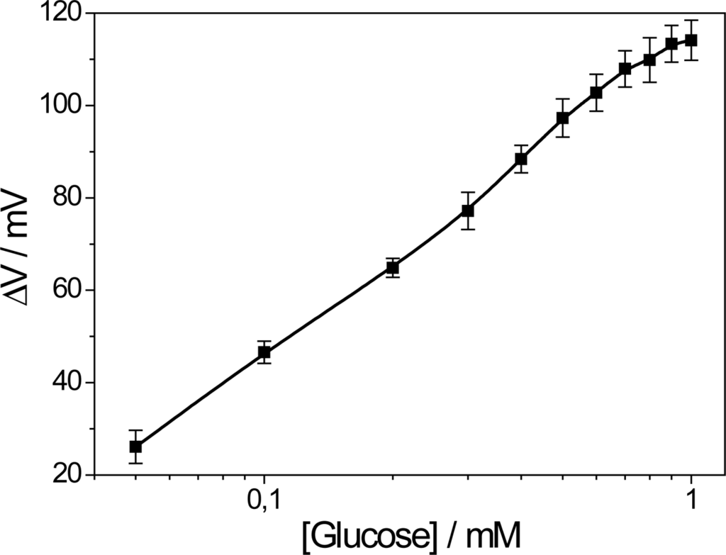 The dependence of the voltage response versus glucose concentration (analytical curve) is shown in Figure 3. The linear range is up to 0.4 mM with detection limit of 0.027 mM determined in the linear region of the biosensor calibration curve according to the literature [13].