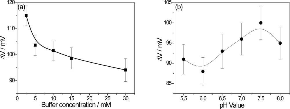 Upon detection of glucose, the sub-products of the GOx reaction change the pH locally, affecting the electrical properties of the PPI/NiTsPc-GOx FET-based glucose biosensor. It is of importance, then, to study parameters such as pH and buffer concentration, which directly affect the enzyme activity and consequently, the final results. In order to understand the influence of the buffer concentration, studies were made with phosphate buffer over a range of 2.5 mM to 30 mM. It is expected that the pH changes will be more detectable at lower buffer concentrations as a result of minor attenuation of the buffer solution due to ionic strength. The influence of the buffer concentration is shown in Figure 4(a), with the optimum value being achieved of 2.5 mM. However, trying to maintain a certain ionic strength, 10 mM was chosen as the measurement condition.
