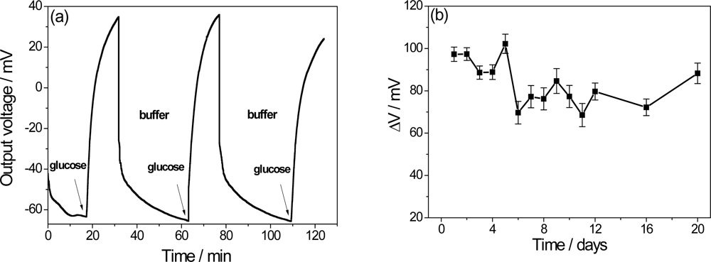 The recovery time is an important factor in a biosensor that is expected to perform successive measurements. A delay in the recovery time of the extended electrode is caused by excess H+ ions from the enzymatically catalyzed reaction from the previous measurement [7]. In order to investigate this characteristic, Figure 5(a) shows the PPI/NiTsPc-GOx FET-based glucose biosensor response after successive immersions in buffer and in buffer solutions containing 0.5 mM of glucose. A recovery time about 50 min is observed with a small loss of signal, suggesting that the ENFET can be used again. To estimate the lifetime, the biochemically sensitive membranes were stored in buffer solution (pH 7.5) and the measurements were carried out through a few days adding 0.5 mM glucose to the measuring cell. As a result, the Figure 5(b) shows an average of 95 mV in the signal in the early days, with decreases by up to 18.5% after long times, leading to the conclusion that the biosensor can be stored for a period of 20 days without significant loss of sensitivity.