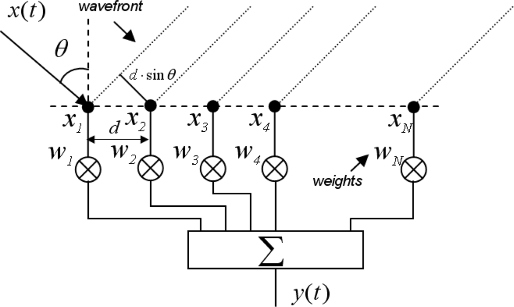 Assuming a plane wave x(t) with a direction of arrival θ, and an array with N sensors separated a distance d, the signal received at each sensor xn, is a phase-shifted replica of x(t). A beamformer combines linearly the signals xn, which are previously multiplied by complex weights wn, obtaining an output signal y(t). Figure 1, shows the structure of a beamformer.