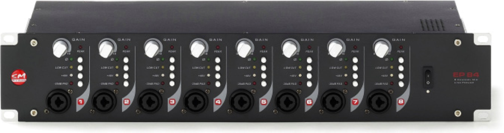 The SM PRO AUDIO EP84 preamplifier features eight channels, independent variable gain control, −60 dB microphone sensitivity, XLR and TRS input and output, 48V Phantom power per channel, 20 Hz–20 kHz bandwidth, −20dB pad, phase reverse and low cut filters. The EP84 is shown in Figure 10.