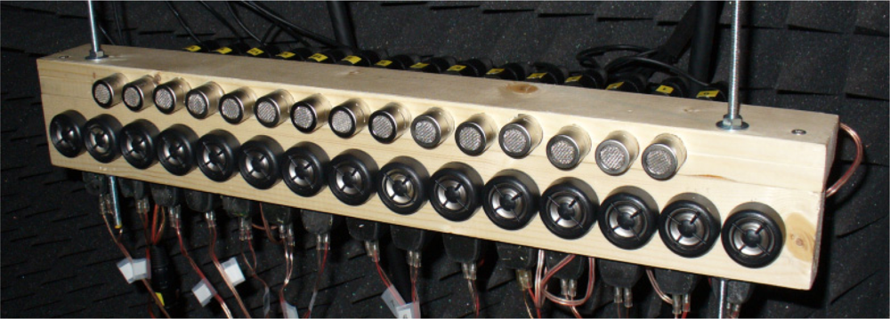 A transmission array with a 50 cm spatial aperture and a reception array with a 40 cm spatial aperture has been used. On the transmission array, the tweeters are placed so as to occupy the minimum space.
