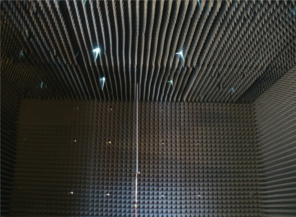 The acoustic anechoic chamber has a 5 × 3 × 2.5 m working area. To eliminate reflections from the walls of the chamber, every surface is covered with absorbent materials with 50 × 50 × 170 mm foam pyramidal wedges. The chamber has been designed for a 500 Hz cut-off frequency. This chamber is shown in Figure 13.