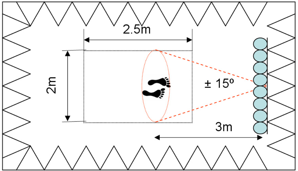 Following the design considerations of Section 3, the system retrieves the acoustic image associated to a rectangle of 2 m × 2.5 m (width × depth) dimensions, where the person under analysis must be located 3 meters away from the line array, as described in Figure 14. As justified in the previous section, 4 frequencies: f1 = 6 kHz, f2 = 8 kHz, f3 = 10 kHz and f4 = 12 kHz were selected.