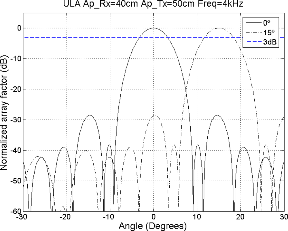 Two ULAs with 15 λ/2-equispaced sensors have been employed. These arrays have different spatial apertures in order to reduce sidelobe levels on the final beampattern (Tx + Rx). Note that sidelobe positions on each beampattern are different, while the mainlobe keeps its position.