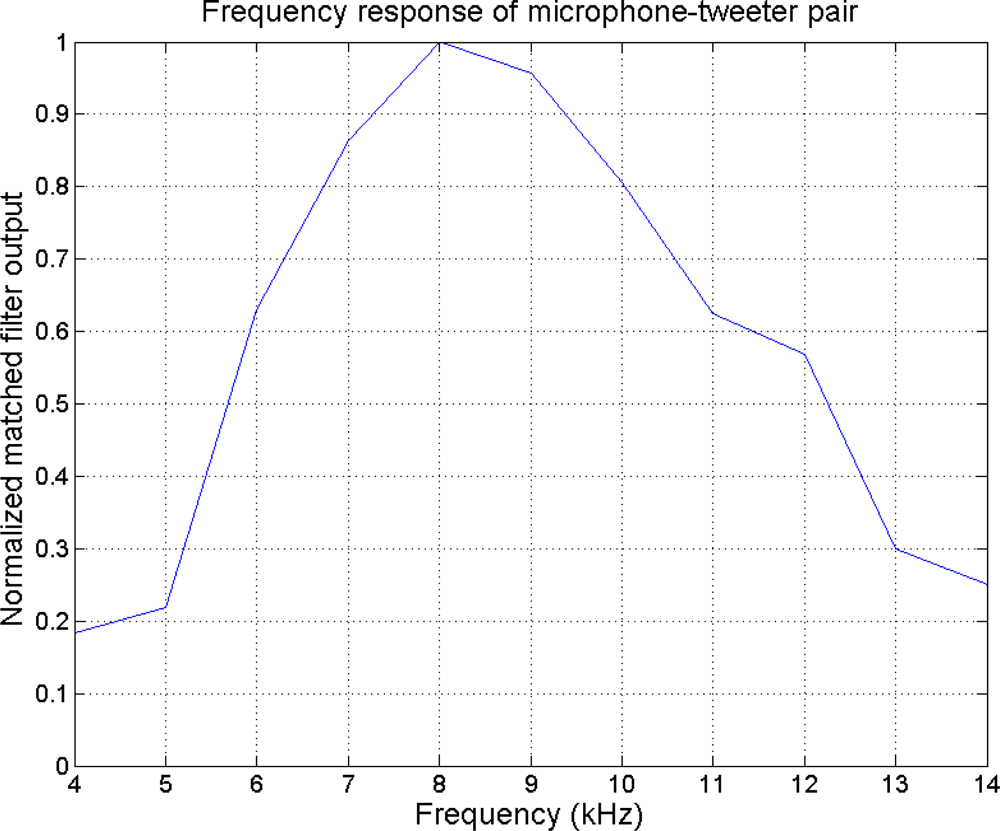 For frequencies below 4 kHz, or above 14 kHz the beampattern degrades significantly and cannot be used. Analyzing the frequency response for the microphone-tweeter pair used (Figure 17), the following results have been obtained.