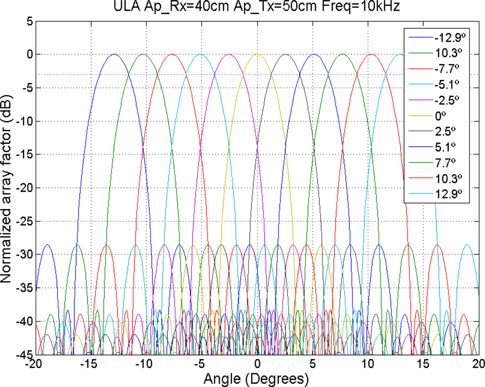 In the design process of the spatial aperture (length) of transmission and reception ULAs, the following parameters must be considered: angular resolution, frequency band, angular excursion and transducer diameter. If the array spatial aperture is increased, the angular resolution improves, however grating lobes appear [].