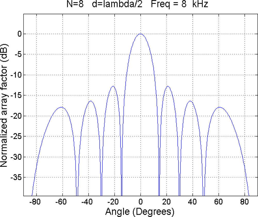 Working with low frequencies increases the main beam width and therefore degrades the angular resolution. Working with high frequencies decreases the main beam width, but grating lobes appear, which degrades the beampattern. On the other hand, we note that main lobe width and grating lobes level increases as the steering angle rises. Therefore, the maximum steering angle should be determined by the size of the person and his/her distance from the array.