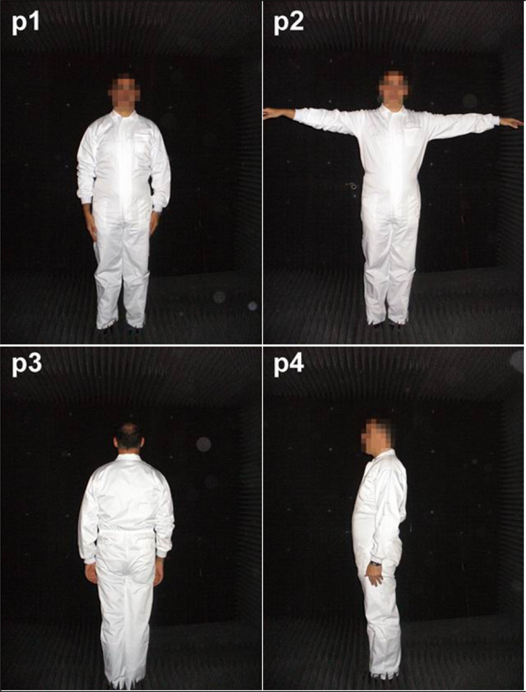 To evaluate the system, acoustic profiles were captured 10 times for each of the 10 people under test. These captures were carried out for 10 days, one capture per person per day, thereby people did not remember their position in the previous capture and there was not a “memory effect”. They were placed in the center of the measurement area (cross marked on the ground). Every 60 seconds, a multifrequency capture was done for each position, with the following sequence: front view (p1) with arms folded on both sides, front view with arms outstretched (p2), back view (p3) and side view (p4).