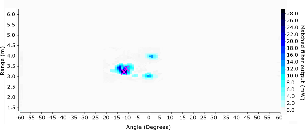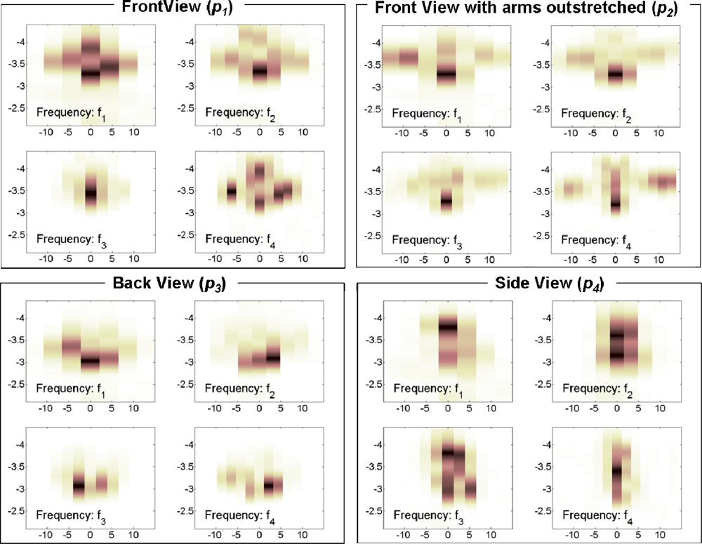 Figure 21 shows the acoustic images for: i) the front view position (p1), where the head and trunk of the subject can be clearly identified ii) the front view position with arms outstretched (p2), where the head and arms of the subject can be clearly identified, iii) the back view position (p3) where the back of the head can be identified and iv) the side view position (p4), where the closest shoulder and side of the head can be identified.