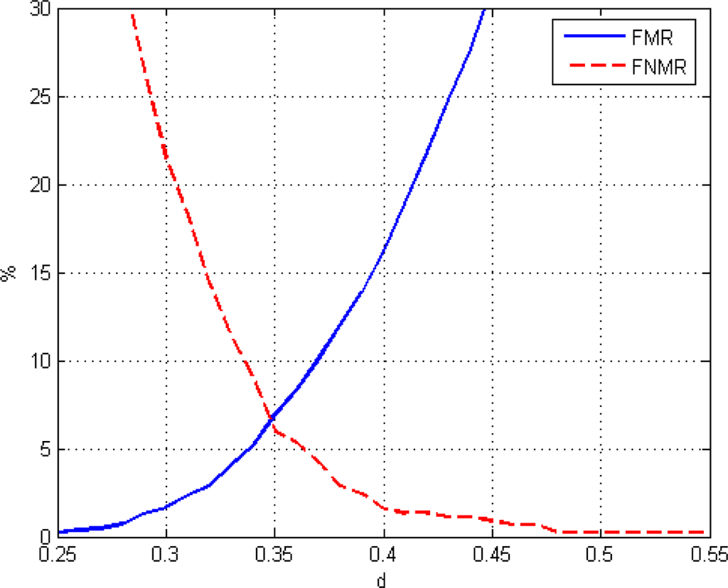 Equal Error Rate (EER) is the crossing point between FMR and FNMR functions. EER is a global parameter that allows the evaluation of the system performance. Thus, the lower the EER value, the better the biometric system performance []. For this case-study, a value of EER = 6.53% for a distance d = 0.35 has been obtained. Figure 23 shows an enlarged area of FMR and FNMR functions in order to show EER clearly.