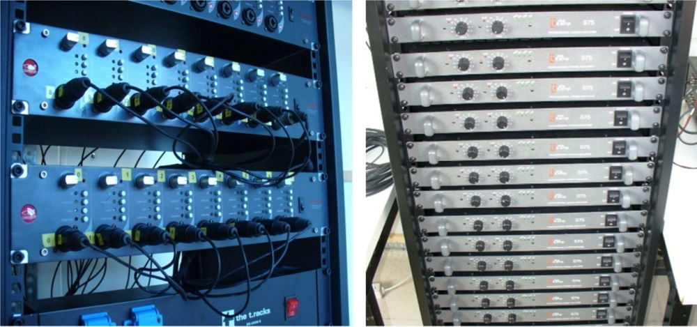 This subsystem is formed by two SM PRO AUDIO EP84 multichannel microphone preamplifiers and eight T. AMP S75 amplifiers, installed on a 19” rack with 48U, as shown in Figure 9.