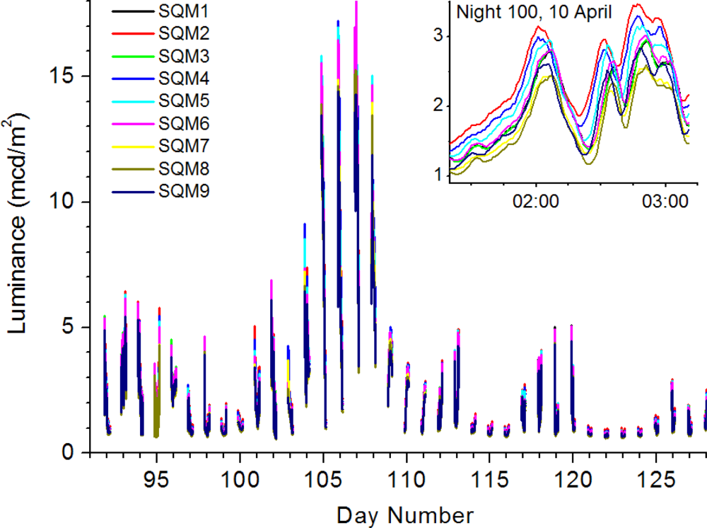 Since the spectral sensitivity of an SQM does not match the photopic eye response, care should be taken when applying the derived luminances as such. However, within the focus of this paper it does not add any uncertainties since we intercompare SQMs of the same type.