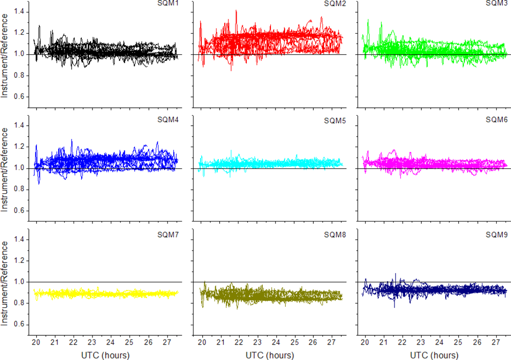 In Figure 2 we plot the measured luminance divided by the constructed reference as a function of time (hours) for the whole intercomparison period. Clearly, different behaviour of the SQMs is found. We can roughly rank the SQM as follows: 5, 6, 7, 9 are stable, 1, 3, 8 show some multilevel behaviour, and 2, 4 show the most scatter. This is further underpinned by the found standard deviations given in Table 1. In this table the averaged ratios of measured to reference are given. Nights with moonlight give rise to the large standard deviations in the means and, not unexpected, variations during clear nights are the smallest. The instruments have a scatter of less than ±14%, for MEA < 0°.