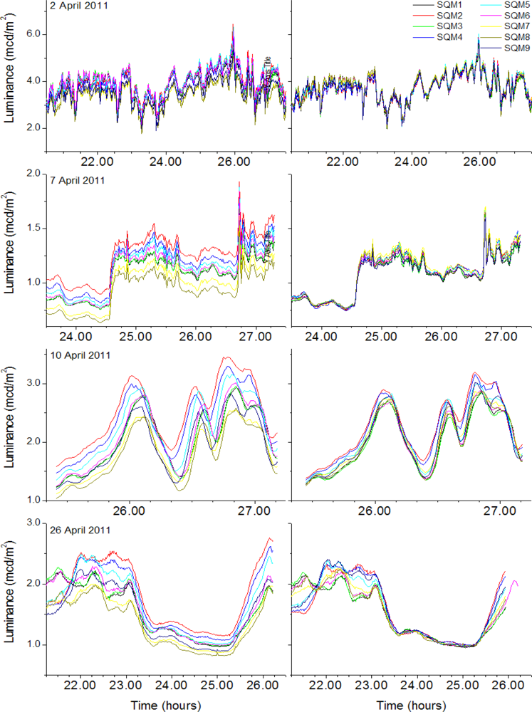 By applying these intercalibration factors, the different data sets almost merge to one curve, as shown in Figure 3. This figure shows both situations for a number of exemplary nights, before and after intercalibration. It could be argued that a simple scaling would have been be sufficient, as the top two panels seem to indicate, but on closer examination, the order of the instruments is interchanged, which would have introduced ambiguity in the sought intercalibration factors. Moreover, time shifts had to be eliminated, clearly visible in the third row. To overcome these obstacles, the more elaborated procedure was followed. The corresponding values of Table 1 are given in Table 3. After the intercalibration the initial scatter of ±14% is reduced to 0.5%, and deviations of night time sums range now from −7% to +9%, which was −16% to 20%. Due to moonlight the “All Nights” column, and even more pronounced in the ‘Moon lit nights only’ column, show large variations in detected signals. This is caused by the fact that the moon is quite bright and moonlight may be detected through side cloud reflections as well. The latter effect has an inherent high spatial and temporal variability. It would require extremely accurate matching field of views of the nine SQMs to obtain similar results in this column compared to the first two columns. Alternatively, we can reverse the argument and state that a good agreement of the measurements under moon lit nights ensures a high accuracy of the alignment of the detectors.
