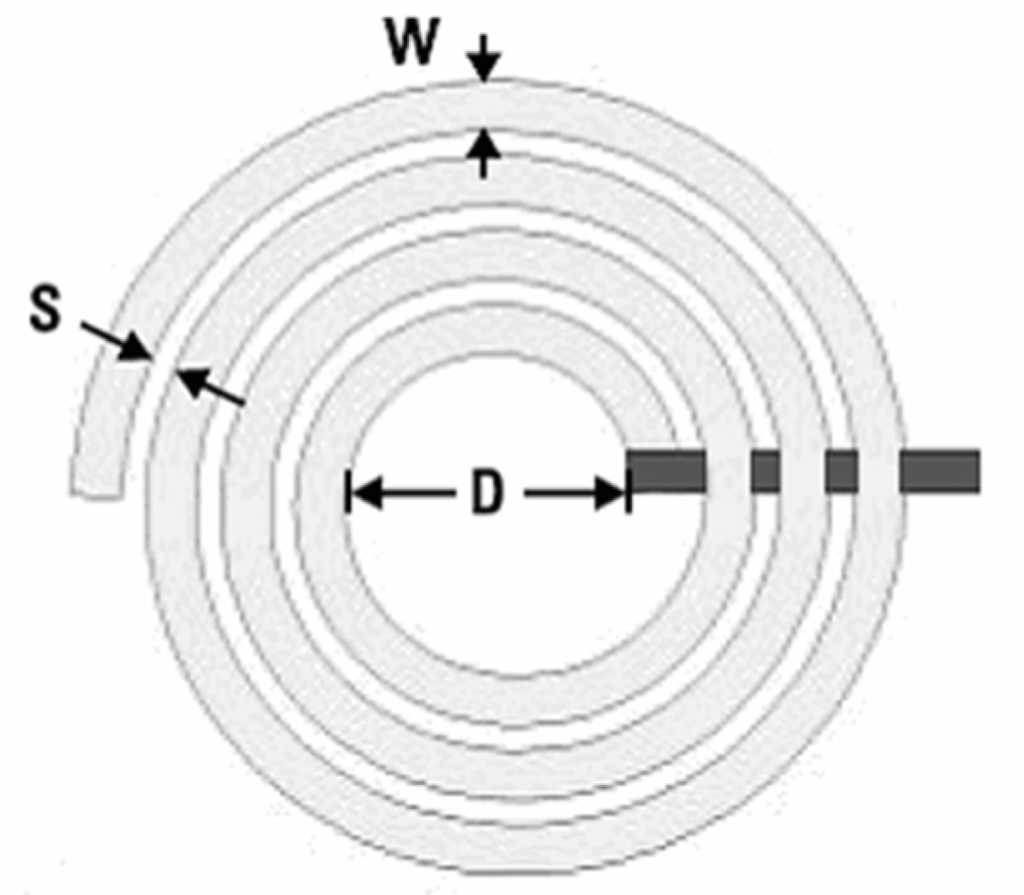 Figure 1 illustrates a planar spiral inductor, where W is the wire width of the spiral inductor, D is the internal diameter of the spiral inductor and S is the spacing between the wires of the spiral inductor. In this investigation, the planar spiral inductor is designed with W = 10 μm, D = 136 μm, S = 2 μm, its thickness is about 0.95 μm, and the number of turns is 3.5.