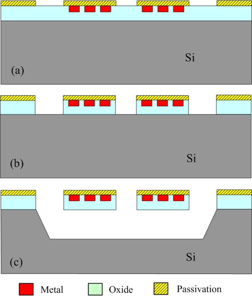 The commercial TSMC (Taiwan Semiconductor Manufacturing Company) 0.35 μm CMOS process is utilized to manufacture the micro spiral inductor on silicon substrate. The 0.35 μm CMOS process contains one polysilicon layer and four metal layers, in which all metal layers are aluminum and are insulated by silicon dioxide layers. Thickness of each silicon dioxide layer is about 1 μm. The silicon substrate is p-type (1 0 0) orientation. We design the layout of the spiral inductor, and TSMC uses the 0.35 μm CMOS process to fabricate the spiral inductor. Figure 3 shows the process flow of the spiral inductor [17]. Figure 3(a) presents the spiral inductor after completion of the CMOS process. Material of the spiral inductor is aluminum metal. The spiral inductor requires a post-process to remove the underlying silicon substrate in order to reduce the substrate loss and enhance the Q-factor.