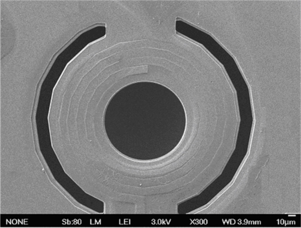 The post-process includes two steps. One removes the sacrificial oxide layer, and the other step is to etch silicon substrate. Figure 3(b) illustrates the sacrificial layer of silicon dioxide etched by a dry etching. An anisotropic RIE CHF3/O2 dry etching is employed to etch the sacrificial oxide layer, and to expose silicon substrate. The etching conditions are RF power 150 W, pressure 10 mtorr, gas flow of CHF3 16.8 sccm with O2 4 sccm, and the etching rate is about 900 Å/min. Figure 3(c) depicts that a wet etching is utilized to etch the underlying silicon substrate. The etchant of 25 wt% TMAH at the temperature of 70 °C is used to etch the underlying silicon substrate, and to obtain the suspended spiral inductor. A magnetic stirrer rotating with speed of 100 rpm is utilized to facilitate uniform etching during etching the silicon substrate. The etching rate of the TMAH etchant is about 18 m/h. Figure 4 shows an SEM (scanning electron microscope) image of the spiral inductor after the post-process. The post-process is compatible with the CMOS process.
