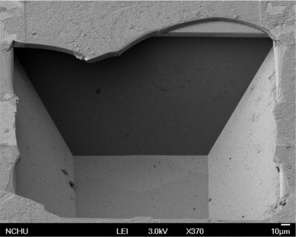 A probe was utilized to scrape the suspended spiral inductor for measuring the etching depth between the spiral inductor and silicon substrate after the post-process. Figure 5 shows a SEM image of the cavity on the underlying silicon substrate after scraping the suspended spiral inductor off. A white light interferometer (Zoomsurf 3D from Fogale Nanotech Co.) was used to measure the depth of the cavity.