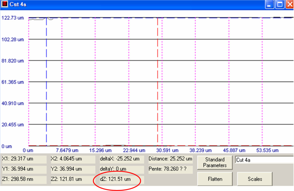 Figure 6 shows the measured results of the cavity depth by the white light interferometer. The results revealed that the distance between the spiral inductor and silicon substrate was about 121 μm.