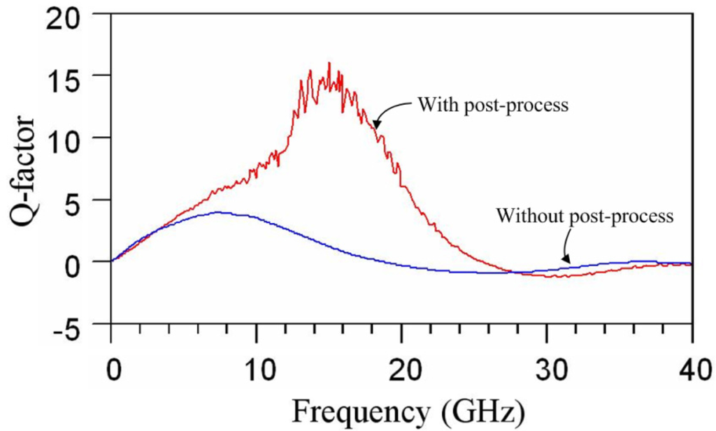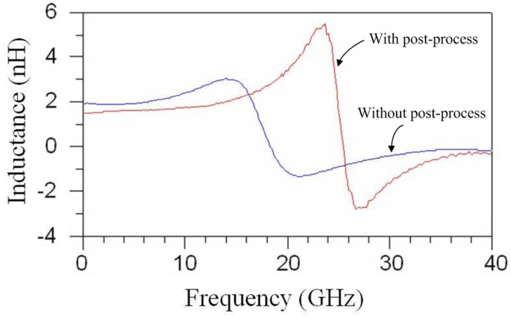 The performance of the spiral inductor was measured by an Agilent 8510C network analyzer and a Cascade probe station. The spiral inductor was set on the Cascade probe station, and the network analyzer recorded the inductance and Q-factor of the inductor. The parasitic effect of the pad in the inductor must to be removed by using the de-embedding procedure. Hence, a dummy open pad was designed for de-embedding the parasitic effect. The de-embedding procedure was the measured values of the spiral inductor to subtract the measured values of the dummy open pad to remove the parasitic effect of the cables and the chip. The spiral inductor before and after the post-process was measured in the frequency range of 0.1–40 GHz. Figure 7 displays the inductance of the spiral inductor with and without the post-process.
