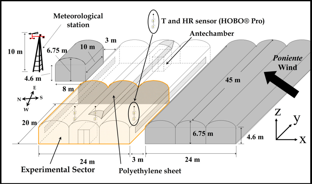 Outside climatic conditions were recorded (frequency 0.5 Hz) by a nearby meteorological station placed at a height of 10 m (Figure 1). The meteorological station included a BUTRON II measurement box (Hortimax S.L., Almería, Spain) equipped with a Pt1000 temperature sensor and a capacitive humidity sensor (temperature measurement range −25 °C to 75 °C; accuracy ±0.01 °C; humidity range 0% to 100%; accuracy ±3%). Outside wind speed was measured with a Meteostation II (Hortimax S.L.), incorporating a cup anemometer (measurement range 0 to 40 m s−1; accuracy ±5%). Wind direction was measured with a vane (accuracy ±5°). Solar radiation was measured using a Kipp Solari (Hortimax S.L.) sensor (measurement range 0 to 2,000 W m−2; accuracy ±20 W m−2).