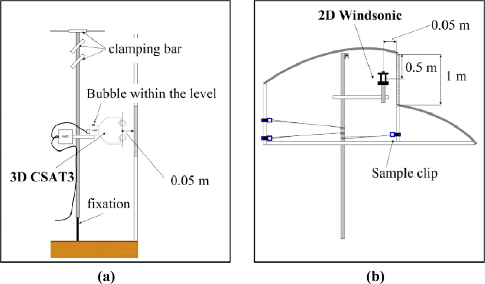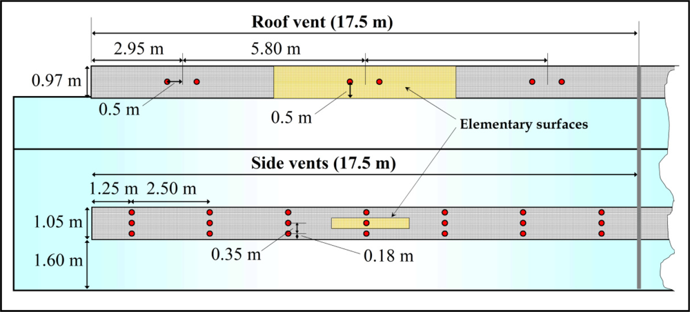 Two 3D sonic anemometers were used to determine the air velocity at the side vents [Figure 3(a)], one per vent, and taking measurements at each point over 3 min. This time period is a compromise between a shorter one that may reduce accuracy and a longer one that may increase the overall difference with regard to outside microclimate parameters [23]. Six 2D sonic anemometers were used to measure the air velocity at the roof vent [Figure 3(b)], taking continuous measurements.