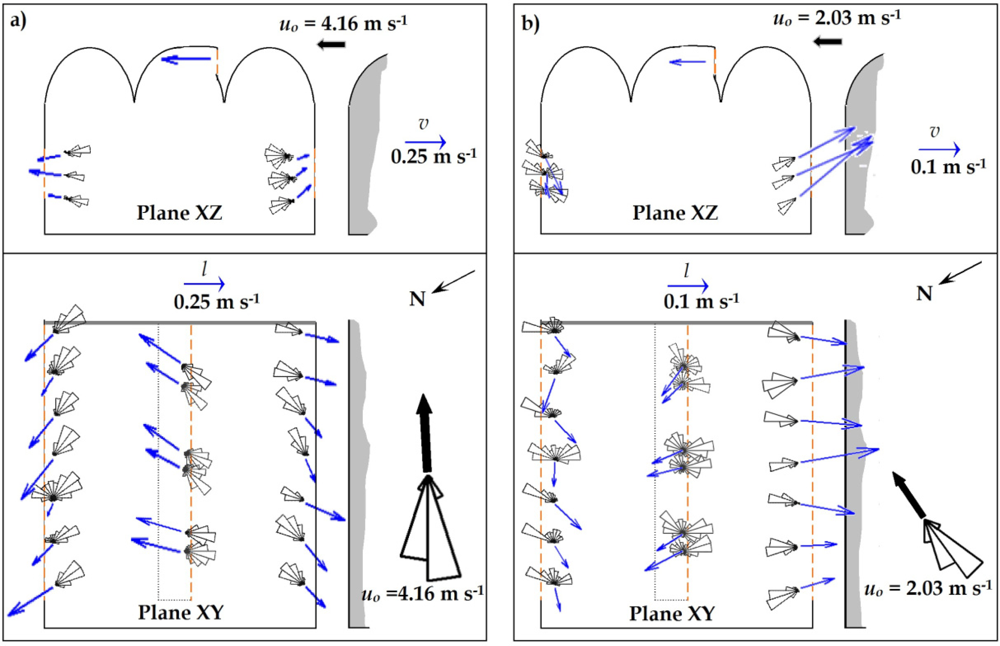 The wind can either assist the buoyancy force or oppose the airflow [34]. For opposing winds, we can observe the alternation of positive and negative flows (entrance and exit of air, respectively) at the roof vent [Figure 4(b)]. A certain discrepancy between wind direction and the direction of airflow entering the greenhouse through the roof vent was observed in some experiments. These differences may be due to the location of the meteorological station, which recorded the characteristics of the wind once it had passed through the experimental greenhouse.