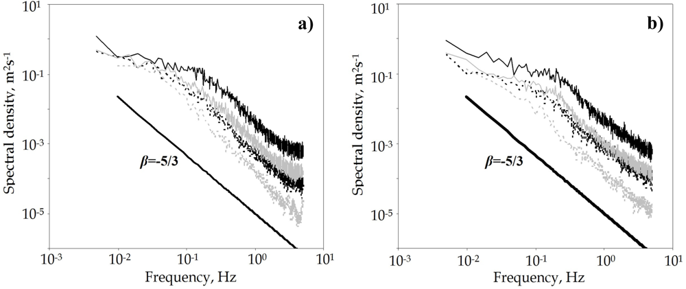 According to turbulence theory, turbulent flow can be regarded as the superposition of eddies of different scales [29]. The spectrum of energy density, E(f) [m2 s−1], gives the relationship between the frequency of a signal f and the energy of the corresponding eddies. The discrete energy spectrum E(f) is calculated by [29]: