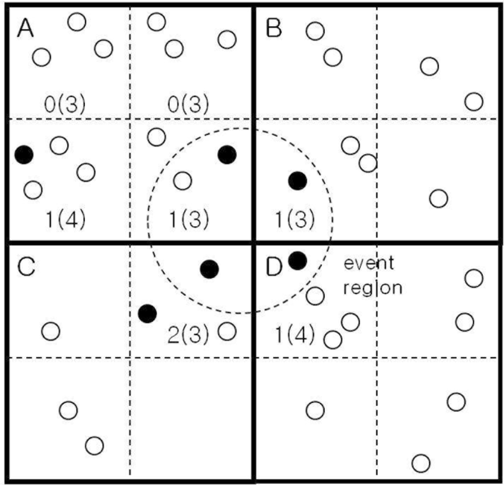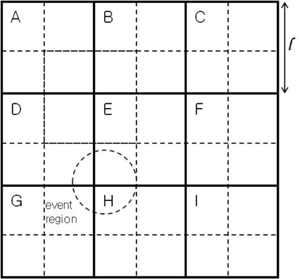 In order to cope with poor performance in the case of a small event region, we further divide each grid (in solid lines) into four sub-grids (in dotted lines) as shown in Figure 1, where each grid, except for the corners and sides, overlaps with eight square regions (SRs from here on) of 2 × 2 sub-grids, in eight different directions. In Figure 1, the grid E in the center, for example, has 8 overlapping SRs. In the NW direction, for example, there is an SR, in thick dotted lines. We name it SRABDE, to indicate the four grids involved. In the N direction, the SR can be denoted by SRBE (i.e., two sub-grids from grid B and two sub-grids from grid E).