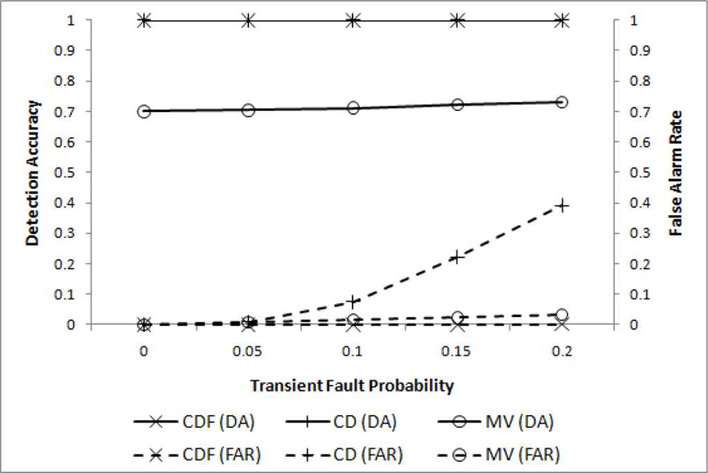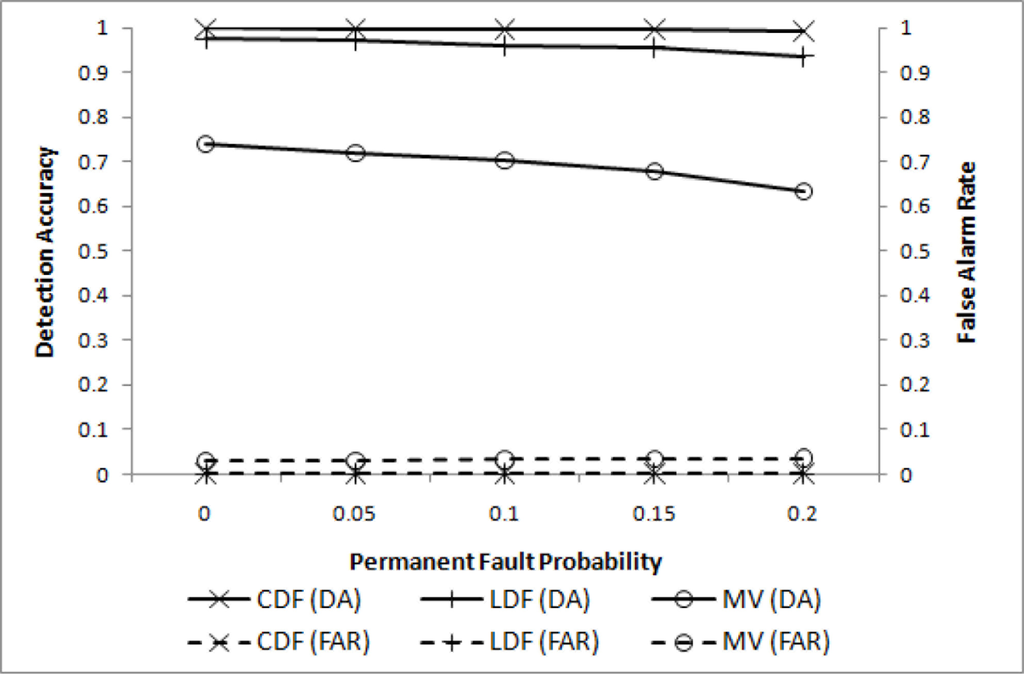 In the first experiment, only transient faults are assumed to evaluate the effectiveness of filtering. Four different values of pt (0.0 ≤ pt ≤ 0.2) are chosen for m = 2 (i.e., l = 2r), w = 4, q = 3, and . The resulting DA and FAR are shown in Figure 3, where our CDF (cooperative decision with filtering) and CD (cooperative decision without filtering), and the well-known MV(majority voting) are compared.