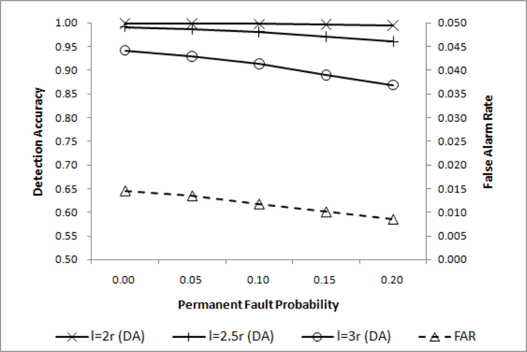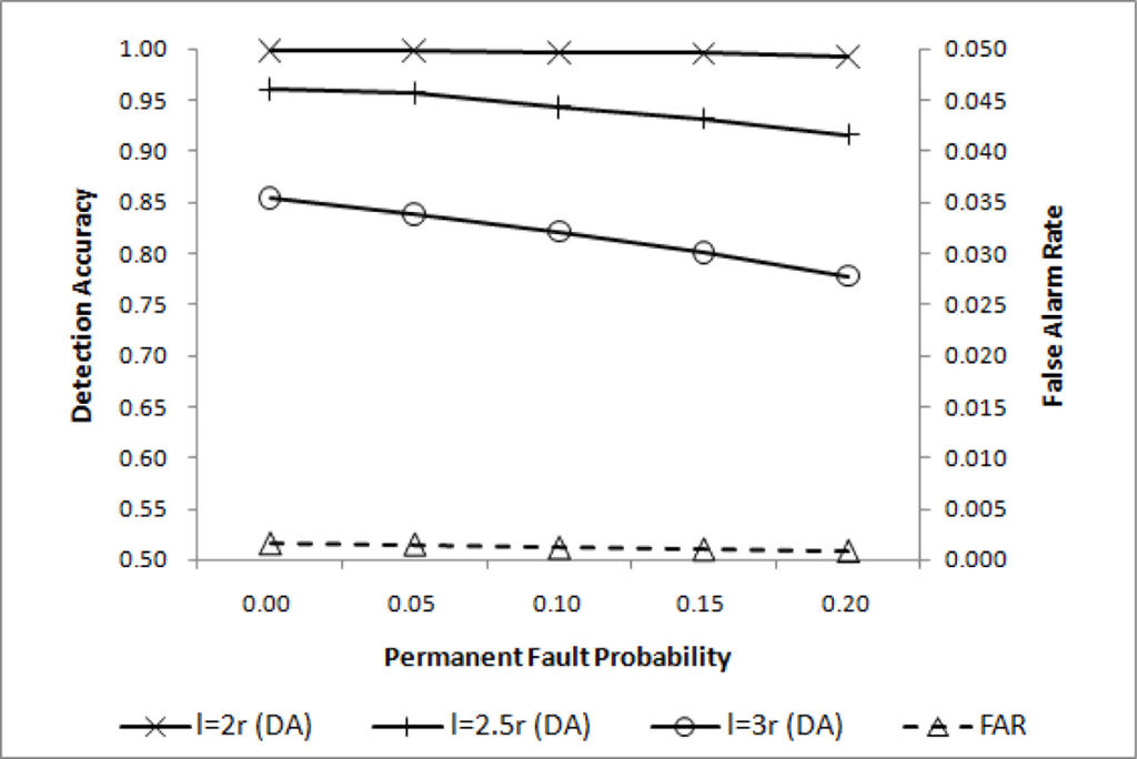 Filtering out most errors induced by transient faults will effectively reduce the transient fault probability pt. For transient faults occurring randomly and independently in sensor nodes with the same probability pt, the effective transient fault probability p̃t for various values of w and q can be estimated using , and the resulting reductions are shown in Table 2, where pt = 0.2 is assumed. If w = 4 and q = 3, for example, pt can be effectively reduced from 0.2 to 0.027.