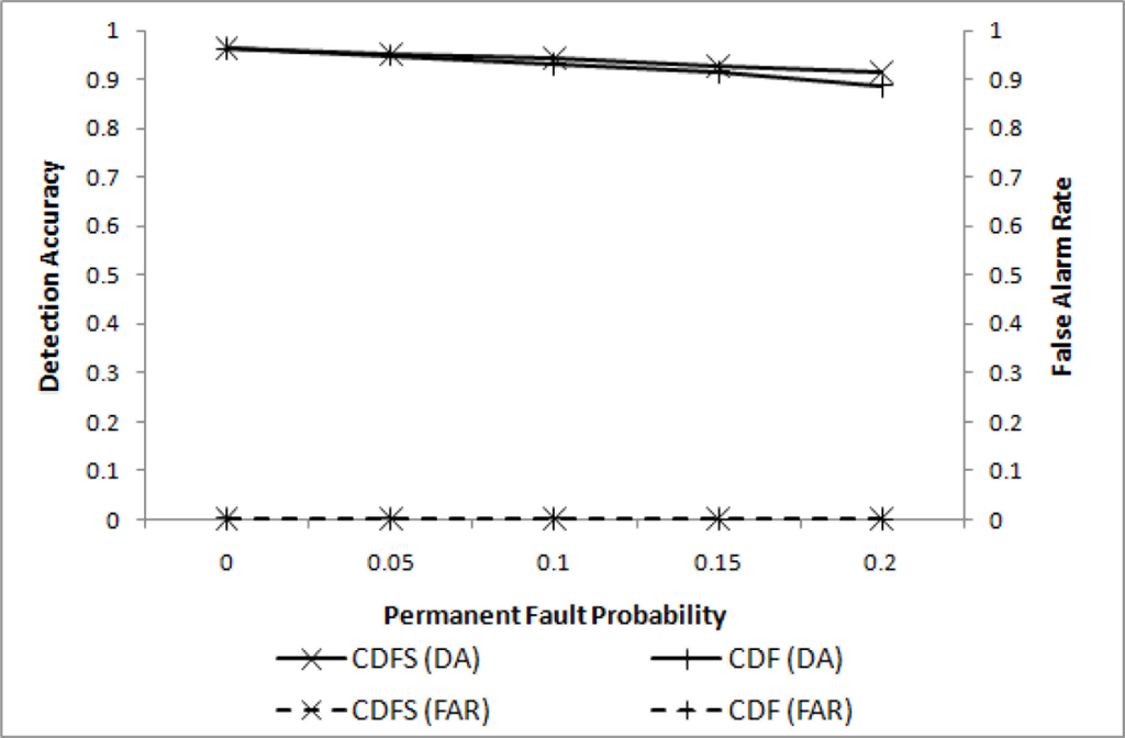 As addressed in the previous section, stuck-at-0 nodes can be detected when they are in an event region and the event boundary is identified. They can also be detected if sensor readings of a stuck-at-0 node are confined to a relatively small range over a long period of time compared to the readings of a normal node. If stuck-at-0 nodes are isolated, some additional gain can be expected. The improvements are shown as shown in Figure 7, where CDFS (cooperative decision with filtering and stuck-at-0-removal) and CDF (cooperative decision with filtering) are compared. As noted in the figure, the difference in DA is negligibly small for a relatively small pp.