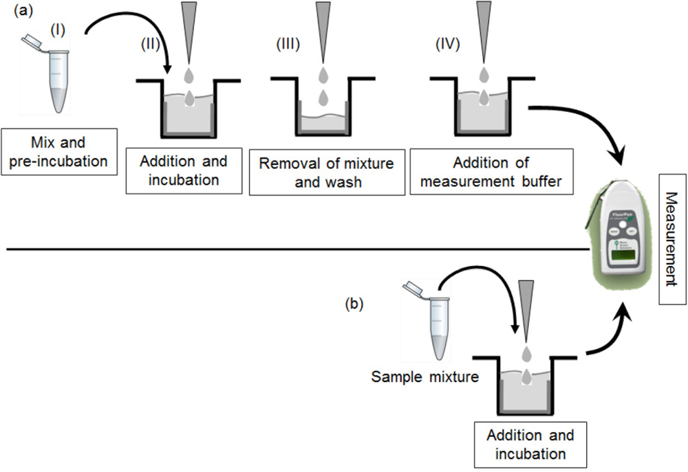 The green fluorescent protein (GFP) has emerged as a powerful reporter molecule for monitoring gene expression, protein localization and protein-protein interaction [12]. It has been demonstrated that in vitro interaction takes place between a trans factor and a cis element of bacterial transcriptional switches [13]. The report indicates that a degree of the interaction can be quantified by fusing GFP to the C-terminus of a trans factor and immobilizing a cis element on solid surface, and the fluorescent intensity decreases with an increase in toxic metal concentrations. In the assay, E. coli cell lysates containing ArsR-GFP or CadC-GFP were pre-incubated with As(III) or Cd(II) solution, loaded into wells, on which ars promoter-ars operator (Pars-Oars) or cad promoter-cad operator (Pcad-Ocad) were immobilized, respectively, incubated for 15 min and removed from the wells (Figure 1(a)). Then, the wells were washed off once by phosphate buffer to remove extra proteins and filled with measurement buffer to dissociate proteins from the cis element. The supernatant was removed from the wells and poured into a measurement vial. Finally, fluorescence intensities of ArsR-GFP or CadC-GFP of the supernatant in the measurement vial were measured. Thus, the process required many steps for measurement of metals, therefore lessening of the number of steps in the procedure is essential for easy application of the biosensors to field tests (Figure 1(b)). To minimize storage and transportation costs, lyophilization is one of the most popular techniques for preserving proteins under normal refrigeration conditions, compared to −20 °C or −80 °C. Moreover, in the previous study [13], lyophilized lysates had to be rehydrated by addition of purified water before use.