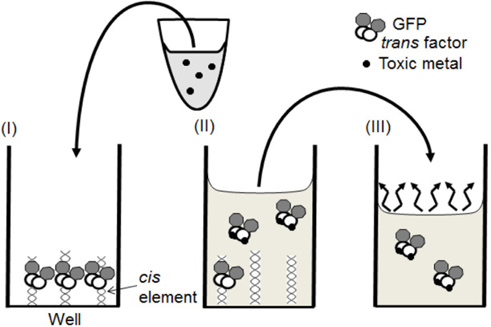 The aim of this work is to develop solid phase biosensors, in which water samples could be directly added to a complex of GFP-tagged trans factor and immobilized cis element and toxic metals could be quantified with fluorescence of GFP-tagged trans factor released from the cis element (Figure 2). As, in the new method the number of steps in the assay procedure are reduced and the complex is rehydrated by direct addition of sample, these solid phase biosensors could be advantageous for simple and on-site detection of toxic metals compared to traditional analytical methods.