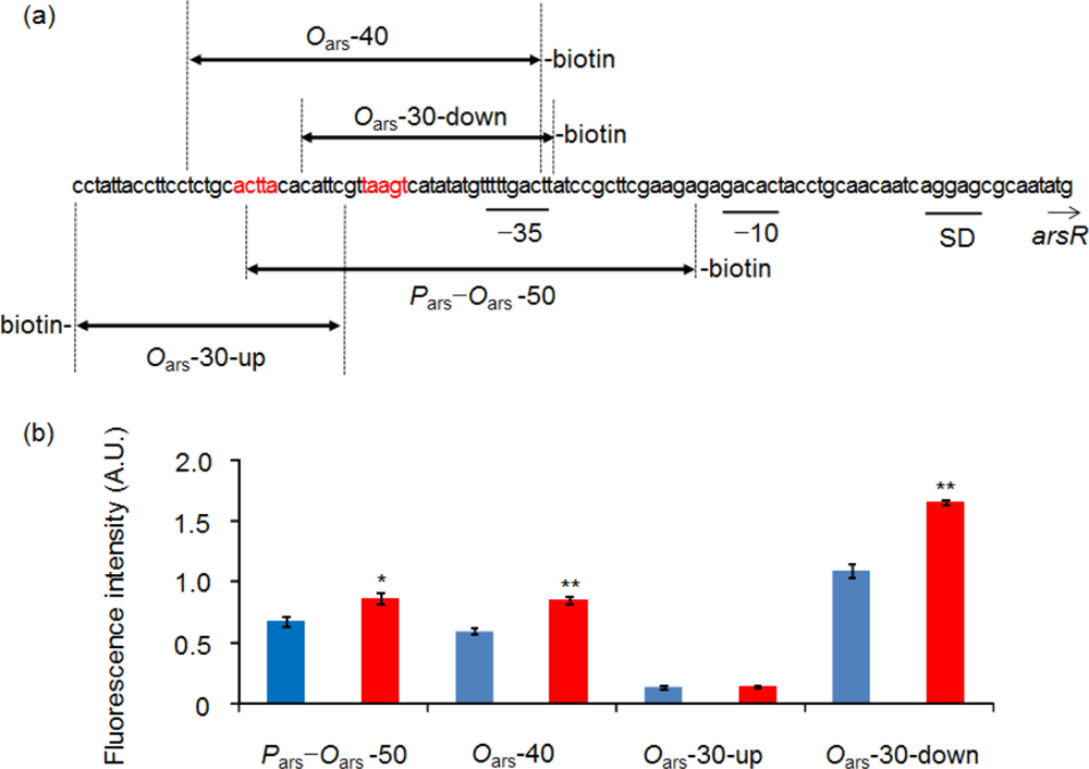 Escherichia coli ArsR [11] and Staphylococcus aureus CadC [16] lose binding capability to Oars or Ocad in their metal-binding conformations, respectively [11,16–19]. It is worth to note that in the previously developed biosensors, the association process between trans factor and cis element was evaluated [13] whereas, in the solid phase biosensors, their dissociation process was evaluated. Another important fact demonstrated in this study is that the binding capacity and association/dissociation ratio of ArsR-GFP in response to As(III) are markedly affected by the nucleotide sequences chosen from the promoter–operator region. The response of the solid phase biosensor to As(III) was successively improved by choosing Oars-30-down.