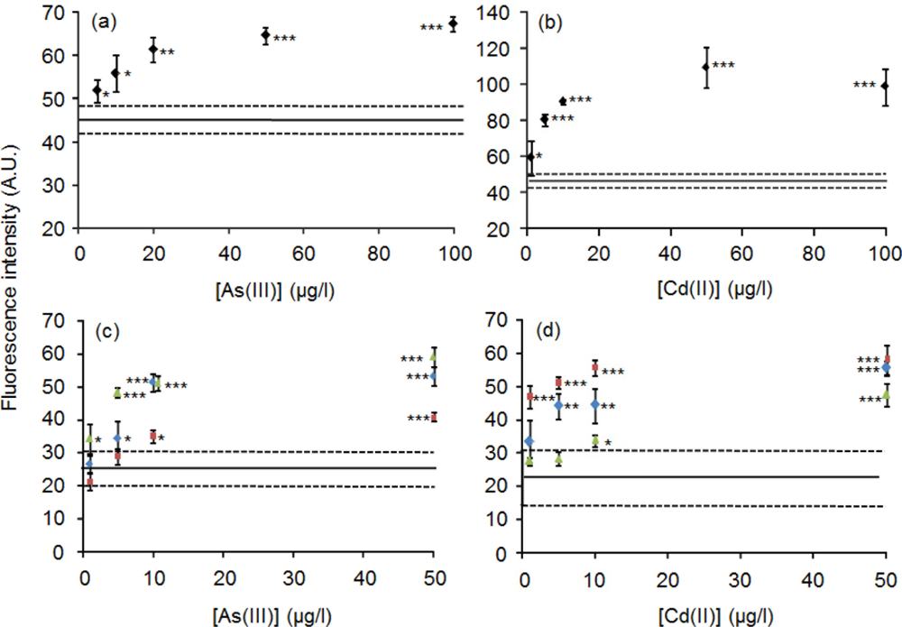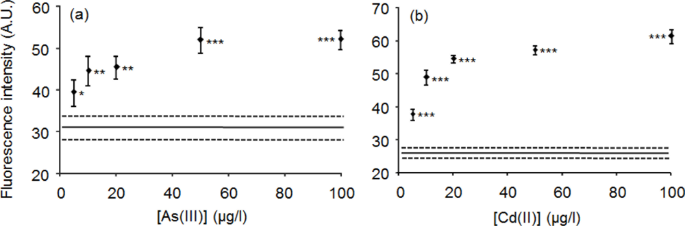 This study showed that the newly developed solid phase biosensors respond to As(III) and Cd(II). However, besides the specific toxic metals, the biosensors must respond to Sb(III), Pb(II) and Zn(II) because the specificities of ArsR-GFP to Sb(III) and CadC-GFP to Pb(II), Zn(II) and Sb(III) have been demonstrated [13]. The generally recognized advantages of metal-monitoring biosensors over traditional methods such as AAS and ICP are their capability of on-site measurement, low cost and easy manipulation. In this study, solid phase biosensors with easy manipulation were successively developed while maintaining the low detection limits (<10 μg/L) of the previously developed biosensors [13] in comparison with the detection limits of flame AAS (∼1 mg/L) [20,21], ICP-Atomic Emission Spectroscopy (30 μg/L) [22].