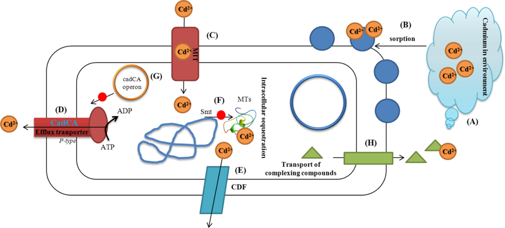 Quite extensive data sets of cadmium concentrations in the water column exist for specific locations in the world’s oceans and for different years over the last two to three decades. Through the literature search performed for this review, however, no examples of modelling or other quantification of the general horizontal transport of cadmium—or any other heavy metals—with ocean currents have been identified. Only two examples of quantification of the exchange of heavy metals (lead and cadmium) with ocean currents between one specific ocean, the Arctic Ocean, and neighbouring oceans was identified. These examples suggest that ocean transport may be an important pathway. In addition, the presence of cadmium in ammonium and phosphorus fertilizers is other important entry route of cadmium into the soil [,]. The chemistry of cadmium is to a great extent controlled by pH. Cadmium may be adsorbed on clay minerals, carbonates or hydrous oxides of iron and manganese or may be precipitated as cadmium carbonate, hydroxide, and phosphate. Under acidic conditions cadmium solubility increases, and very little adsorption of cadmium by soil colloids, hydrous oxides, and organic matter takes place. Both toxicity and bioavailability of cadmium are influenced by soil characteristics. Although cadmium is ranked as non-essential heavy metal, it is already toxic to plants, animals and humans at low doses and acts as a cumulative poison [,]. Some cadmium compounds are relatively water soluble, mobile in soil and bioavailable, depending on the water and soil chemistries. It tends to bioaccumulate in organs such as the kidney and liver of vertebrates, but aquatic invertebrates and algae can also build up relatively high concentrations. Effects on birds and mammals are mainly due to kidney damage. In sea birds and marine mammals in particular, cadmium accumulates to relatively high levels. Microorganisms are very prone to such accumulation, however, this phenomenon makes it possible to use some microorganisms as a biosensor for detection of selected substances contaminating the environment []. The mechanisms of metal accumulation by microorganisms are summarized in Figure 1: (1) metal resistance of microbes is accomplished by intra- and extracellular mechanisms; (2) metals can be excreted via efflux transport systems; (3) sequestering compounds of the cytosol can bind and detoxify metals inside the cell; (4) the release of chelators into the extracellular milieu leads to bound and fixed metals; (5) the structure of the cell envelope is prone to bind large amounts of metals by sorption thus preventing influx []. A great number of heavy metal resistant bacteria such as Cupriavidus metallidurans and others, is known to possess efflux transporters that excrete toxic or overconcentrated metals [–].