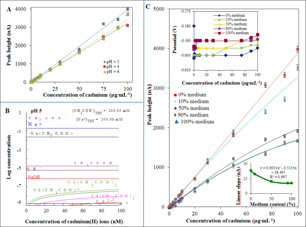 The distribution of individual forms of cadmium complexes (at a concentration from 0 to 100 nM) in the presence of 200 mM acetate buffer of pH 5 is shown in Figure 2(B). Given our objective to study the effects of cadmium(II) ions on bacterial culture of S. aureus, it was necessary to monitor the effects of interactions between cadmium(II) ions and the cultivation medium (its composition is described in the Experimental Section and is a very complex matrix, hardly defined). Components of the medium react with cadmium(II) ions very intensely, as it is shown in Figure 2(C). Interactions between cadmium(II) ions and ions of cultivation medium was studied after 60 min. of their mixing at 20 °C. Cadmium(II) ion peak height measured in the presence of 100% cultivation medium decreased for more than 70% compared to cadmium(II) ions standard. Addition of medium to supporting electrolyte led to a shift of the peak height for 10 mV to more positive potentials (in upper inset in Figure 2(C)). The apparent interaction between the components of medium and cadmium(II) ions was expressed by slopes of the measured dependencies (Figure 2(C)). It is obvious that the linear model is less suitable for describing of dependencies shown in Figure 2(C). Confidence coefficients are higher than 0.98 (Table 2). Using a polynomial mathematical models seems to be more convenient (Table 1) due to the fact that confidence coefficients are higher than 0.99. Slopes of the dependencies decreased with the increasing content of cultivation medium for 2 nA per 1% of the medium. Decrease in the slope was faster within the range of the addition of medium from 1 to 50%, at higher levels of medium there was moderate decrease in slope (see in bottom inset in Figure 2(C)). There is still not enough attention paid to the issue of the interactions between the components of cultivation medium and the actual concentration of compound of interest. These changes should be taken into account when one may monitor heavy metals in the environment.