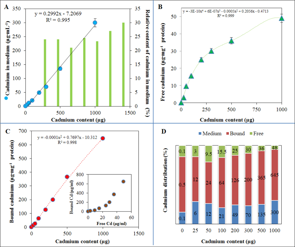 In addition, contents of free and bound cadmium(II) ions in bacterial cells were determined. Figure 3(B) shows the change in free Cd(II) with the increasing applied concentration. The content of free Cd(II) increased up to dose of 250 μg Cd(II) in 25 mL of cultivation medium and, after that, the increase in free Cd(II) content was more gradual. The content of bound Cd(II) increased linearly with the applied concentration of Cd(II) (Figure 3(C)). The inset in Figure 3(C) shows the correlation between bound and free Cd(II) content. The observed dependence shows the two processes, which can be defined by the changes in the behaviour of cadmium(II) accumulation detected after exceeding of free Cd(II) content of 20 μg·mg−1 protein. Figure 3(D) summarizes the ratios between free and bound content of Cd(II) and content of Cd(II) in medium. The highest content Cd(II) was observed bound to the surface of S. aureus cell wall as it was expected. Moreover, Cd(II) content in bacterial cells decreased with the increasing applied concentration, which can be associated with triggering of a number of defence mechanisms against uptake of cadmium(II) ions.