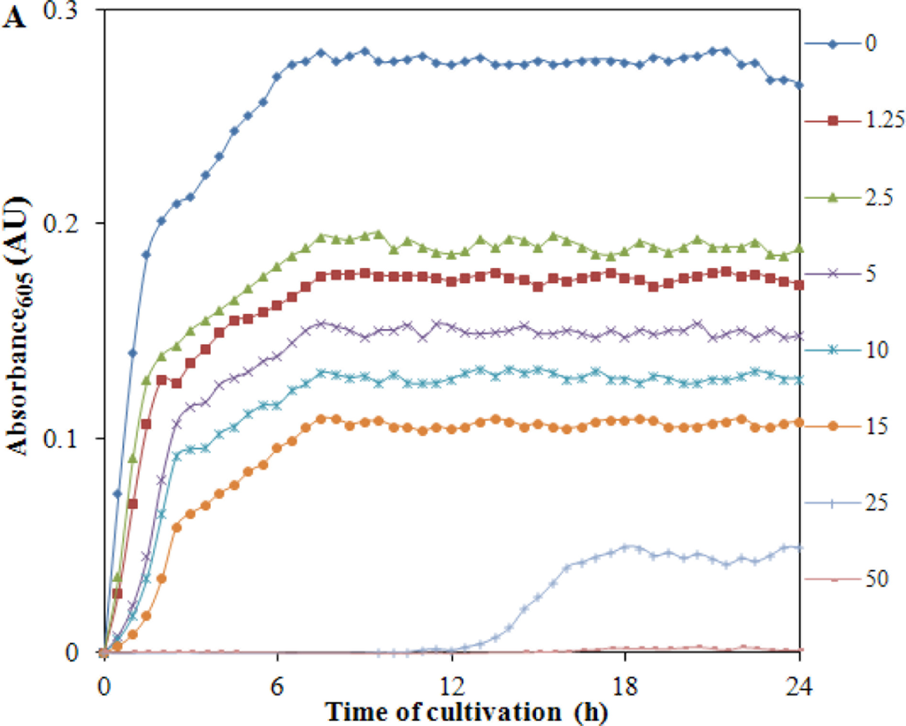Growth of bacterial cells is among the important characteristics of the interactions between bacteria and toxic compounds. For this purpose, growth characteristics were monitored spectrophotometrically using OD measured at 605 nm.