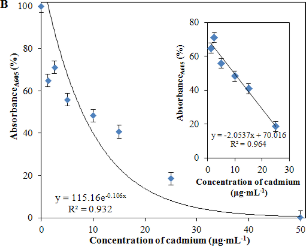 Due to the additions of different concentrations of cadmium(II) ions, start of the exponential growth phase and lag phase were shifted. The applied concentration of Cd(II) (50 μg·mL−1) was significantly inhibitory for the bacterial culture of S. aureus used in this study. In addition, we plotted the growth expressed as OD (absorbance measured at 605 nm) measured in the end of the treatment (24 h). The obtained dependence is shown in Figure 4(B). The resulting changes in the intensity of growth shown in Figure 4(B) are similar to those for growth inhibition of S. aureus bacterial strain RN4220 []. A mathematical model for the whole tested concentration range was used to describe dependence shown in Figure 4(B). The model had the following equation: y = 115.16e−0.106x, R2 = 0.932. In the concentration range from 0 to 30 μg of Cd(II) per mL, the dependence of the linear nature with the following equation y = −2.0537x + 70.016, R2 = 0.9641 was obtained and is shown in inset Figure 4(B). The obtained experimental data clearly shows that the bacterial culture used is very sensitive to the applied concentration of Cd(II) at levels greater than 30 μg·mL−1 and is well suited to assess environmental contamination by heavy metals.