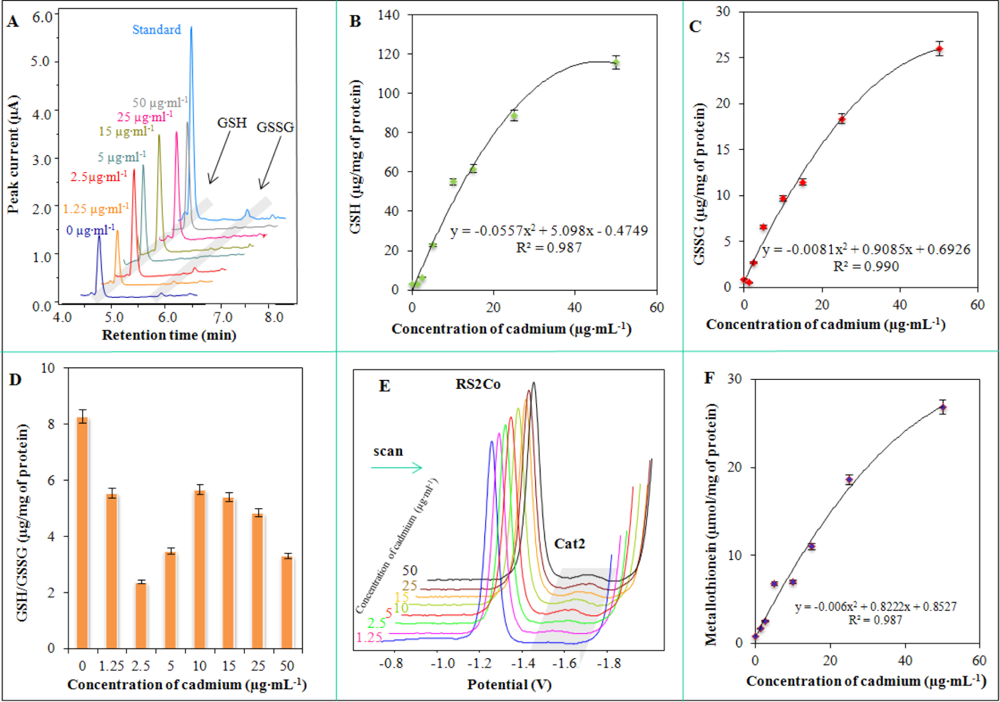 Metallothioneins (MT) as major proteins with heavy metals detoxification functions play an important role in protective mechanisms [,,]. Typical Brdicka voltammograms of MT and MT-like proteins determined in Staphylococcus aureus are shown Figure 5(E). The catalytic signal called Cat2, which is used for quantification of proteins of interest [,–], was detected at −1.55 V. The height of this peak was enhanced with the applied concentration of cadmium(II) ions according to the following equation: y = −0.006x2 + 0.8222x + 0.8527, R2 = 0.987.