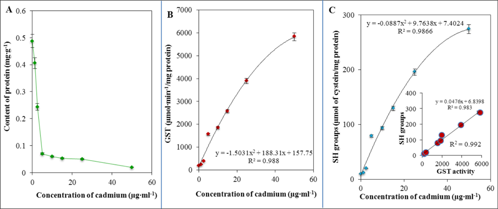 Total proteins content directly corresponds to the activity of individual cells. In Figure 6(A) the dramatic decrease in total protein content at an applied concentration of cadmium(II) ions as low as 5 μg·mL−1 is clearly indicated. This decrease can be clearly associated with alteration of bacterial growth and, thus, with damage to some important biochemical pathways. Besides total proteins content, glutathione is a very important detoxifying molecule and must be activated by the enzyme called glutathione-S-transferase (GST). GST activity exhibited a behaviour similar to other thiol compounds, which means that the activity was enhanced with the increasing applied concentration of cadmium(II) ions according to the following equation: y = −1.5031x2 + 188.31x + 157.75, R2 = 0.988. The dependence is shown in Figure 6(B). Therefore, we also aimed to determine free –SH moieties. Their concentration was also enhanced with the increasing applied concentration of cadmium(II) according to the following equation: y = −0.0887x2 + 9.7638x + 7.4024, R2 = 0.987. The dependence is shown in Figure 6(C). Moreover, we attempted to correlate GST activity and concentration of free –SH moieties, which is shown in the inset in Figure 6(C). A strong correlation between these markers (R2 = 0.992) was found. Table 3 presents the correlation coefficients between levels of thiols. A strong link between the content of MT, GST, GSSG and –SH moieties was revealed. Correlation analysis revealed a strong positive correlation, because the correlation coefficients was always higher than R2 = 0.990. This can be clearly associated with simultaneous triggering of protective mechanisms due to the stress caused by cadmium(II) ions.