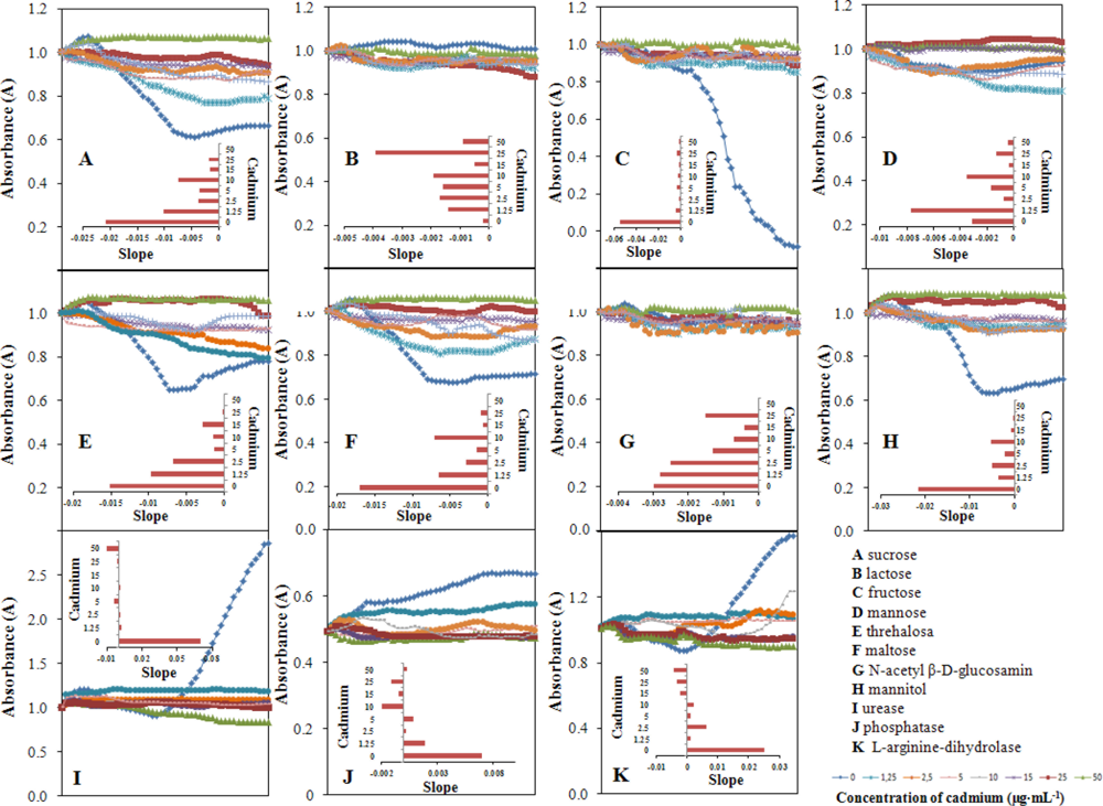 Bacterial culture (100 μL, OD605 0.1) was pipetted into the wells of plates (STAPHYtest, Lachema). Then, cadmium(II) ions were added in the following final concentrations (0, 1.25, 2.5, 5, 10, 15, 25 and 50 μg mL−1). Concentration of the metabolites of interest was determined at 15 min intervals for 24 h. Then, these dependencies were plotted and the slopes of the linear regressions are shown in the insets in Figure 7. The main group of these parameters represent changes in sugar metabolism (sucrose, lactose, fructose, mannose, threhalose, malthose, N-acetyl-d-glucosamine, mannitol) and three enzymes: urease, phosphatase and l-arginine-dihydrolase. Marked differences were observed in mannose, malthose and mannitol metabolism (Figure 7). Similarly, changes were observed in the activity of urease. Some changes in sucrose, fructose, trehalose, phosphatase and l-arginine dihydrolase were also measured, but these can be used for biosensing only in limited intervals. Lactose and N-acetyl-d-glucosamine showed no significant changes and these markers are certainly not suitable for use in sensors (Figure 7).