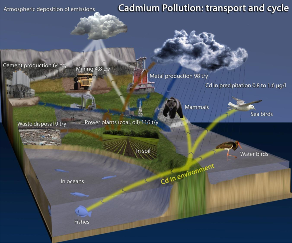 Environmental pollution by xenobiotics is increasingly becoming a global issue. In connection with the growing ecosystem contamination by xenobiotics, it is therefore increasingly important to monitor their presence and promptly assess potential risks to humans []. The United Nations Environment Programme (UNEP) aims at monitoring and removing cadmium from the environment []. Over the last 15 years The Comprehensive Environmental Response, Compensation, and Liability Act (CERCLA) has permanently listed Cd as No. 7 (out of 275 species) in its priority list of hazardous materials []. Cadmium’s fate in the environment is shown in Scheme 1. Cadmium in its elemental form is a soft, silver-white metal, which occurs with other elements in the Earth’s crust with average content of 0.13–0.2 g t−1 in the lithosphere. This element is naturally found in air, water resources and soil as complex oxides, sulphides, and carbonates in zinc, lead, and copper ores []. Mining of iron and zinc ores, the burning of fossil fuels, plastics, dyes or road transport constitute the main sources of environmental cadmium pollution, and therefore the routes whereby it can enter the human food chain []. In mining global cadmium production increased during the period from 1970 to 2004 from about 17,000 tonnes to about 22,000 tonnes. Over the last 15 years, global consumption has remained relatively constant, at around 20,000 tonnes. Improperly disposal of batteries is another source of cadmium pollution []. In the atmosphere cadmium is mainly emitted to the atmosphere in particulate form. From combustion sources, cadmium may, however, be emitted partly as elemental gaseous cadmium, but as it is cooled, this cadmium is also quickly bound to particulate matter, so atmospheric transport of cadmium is governed by aerosol (particle) transport mechanisms.
