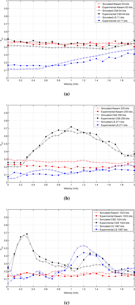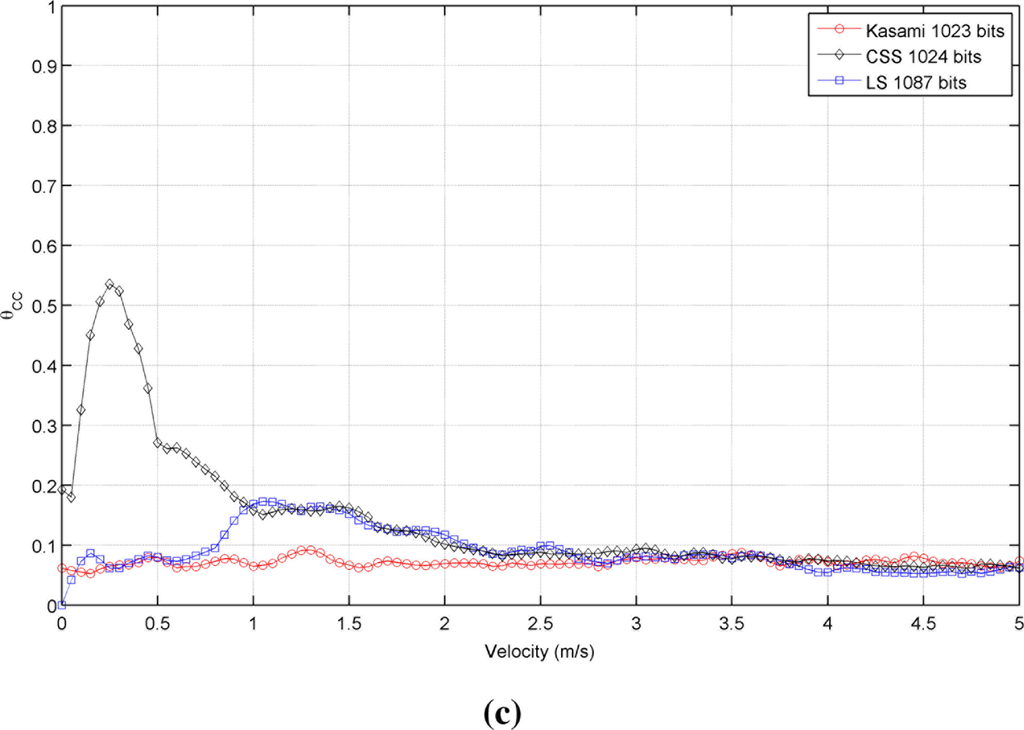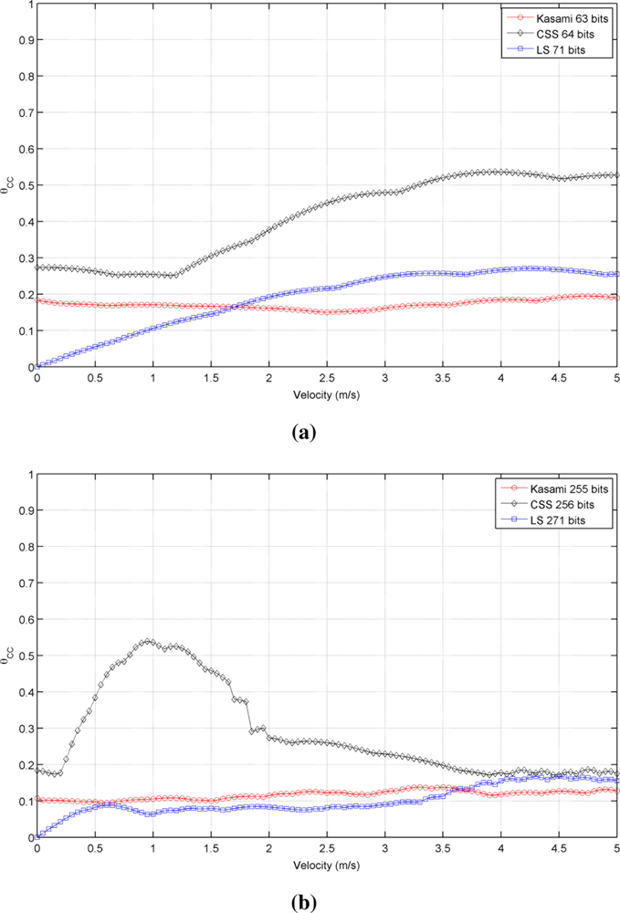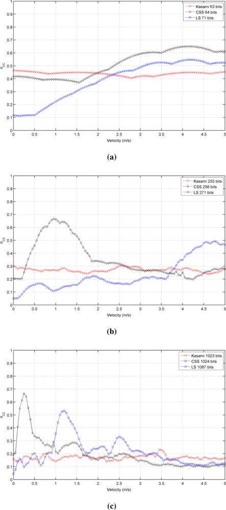 Figure 3 shows the simulated results obtained for the cross-correlation bound θCC as a function of the receiver velocity, for all lengths and sequences under consideration. This figure shows that the receiver movement does not significatively worsen the cross-correlation properties of Kasami codes with respect to the values obtained with a stationary receiver. The behavior of the other two sequences is slightly different. CSS codes begin with a low cross-correlation bound, then, a range of velocities where this bound increases significantly appear, and finally, it decreases to a practically constant value. This tendency is repeated for all lengths, although the range of velocities with large θCC values become narrower with longer sequences. Finally, LS sequences exhibit zero θCC values at zero velocity, and then, this bound increases showing certain variability. In all cases, the best cross-correlation values at high velocities are provided by Kasami codes, although the differences among the three sequences under consideration are not significant.