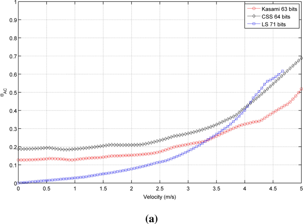 Table 1 shows the receiver velocity for which θAC reaches the practical limit value of 0.5. As can be seen, Kasami sequences provide the larger range of admissible velocities in all cases.