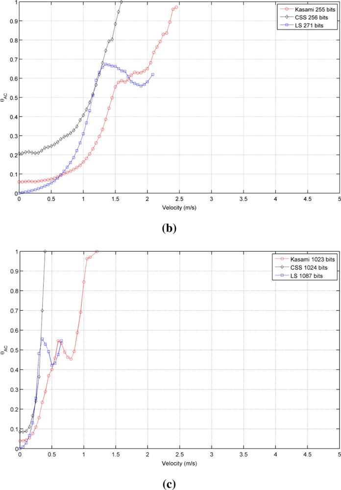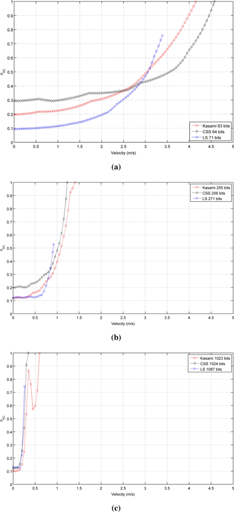 Figure 2 shows the autocorrelation bound θAC as a function of the receiver velocity for the sequences with lengths close to (a) 64, (b) 256 and (c) 1,024 bits. As can be seen, in all cases, the lowest value with a static receiver (v⃗r = 0) is provided by LS sequences, followed by Kasami and finally by CSS, that exhibit the worst behavior. Note that, although the initial values of θAC are better for LS sequences, the increment of its value with receiver velocity is slower for Kasami and both curves cross at a certain point. Also, note that the curve representing the behavior of LS sequences never reaches bound values close to 1 and always ends with a value in between 0.6 and 0.7. This is a negative consequence of the lateral peaks appearing at the boundaries of the IFW, and one of the main drawbacks of LS sequences against the other families of binary codes. Long before the auto-correlation bound can reach values close to 1, these lateral peaks can take amplitudes larger than that of the main peak, thus confusing the peak detector.
